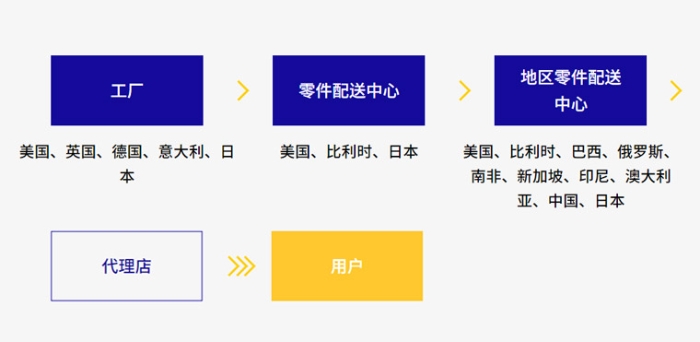 通过遍布全国的代理店网络,高效、快速、便捷地为用户提供所需的纯正零件。