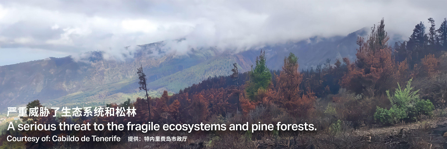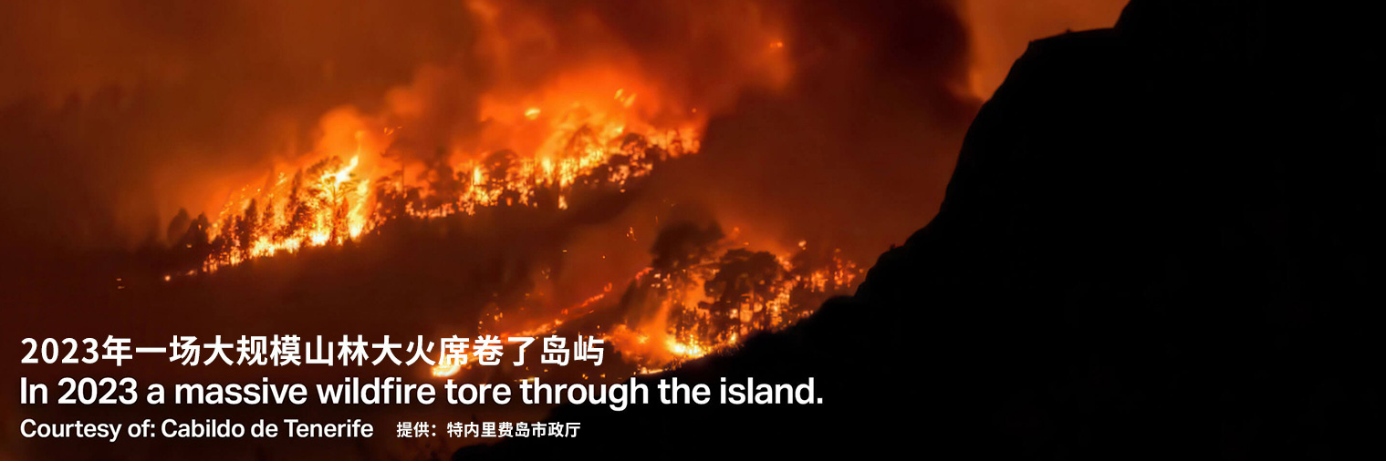 西班牙加那利群岛中最大的岛屿--特内里费岛,在这个被联合国教科文组织列为世界遗产的地方,古老的绿色与火山地貌相融合,阳光穿透薄雾笼罩的山峦,延伸至连绵的松林。然而,由于炎热的气候和松林的组合,这种美丽的风景很容易发生森林火灾。